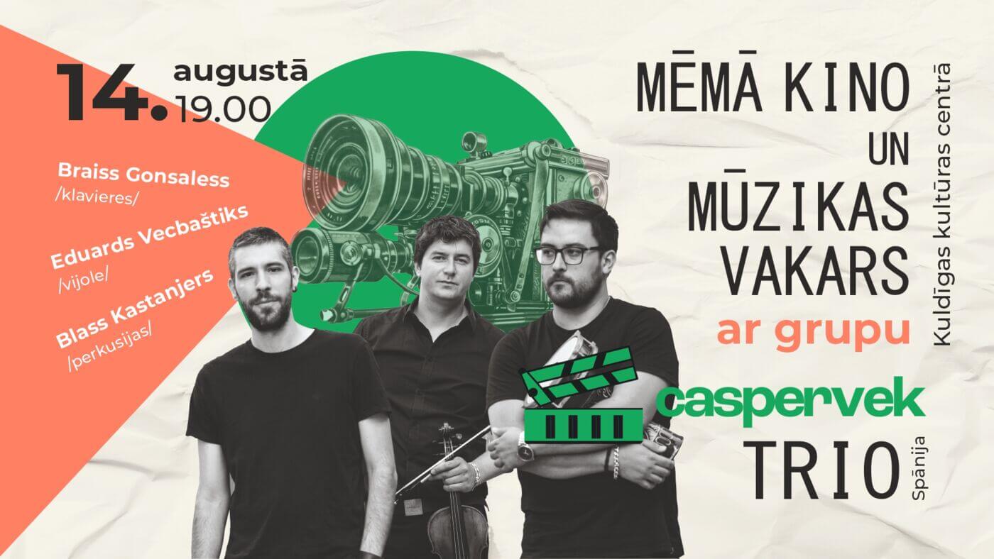 14. augustā 19.00 kultūras centrā – Mēmā kino un mūzikas vakars ar grupu “Caspervek Trio” no Spānijas. Kuldīgas kultūras centrs aicina uz iekštelpu sezonas atklāšanu ar mēmā kino un mūzikas vakaru, kurā uzstāsies kamermūzikas ansamblis “Caspervek Trio” no Spānijas.
