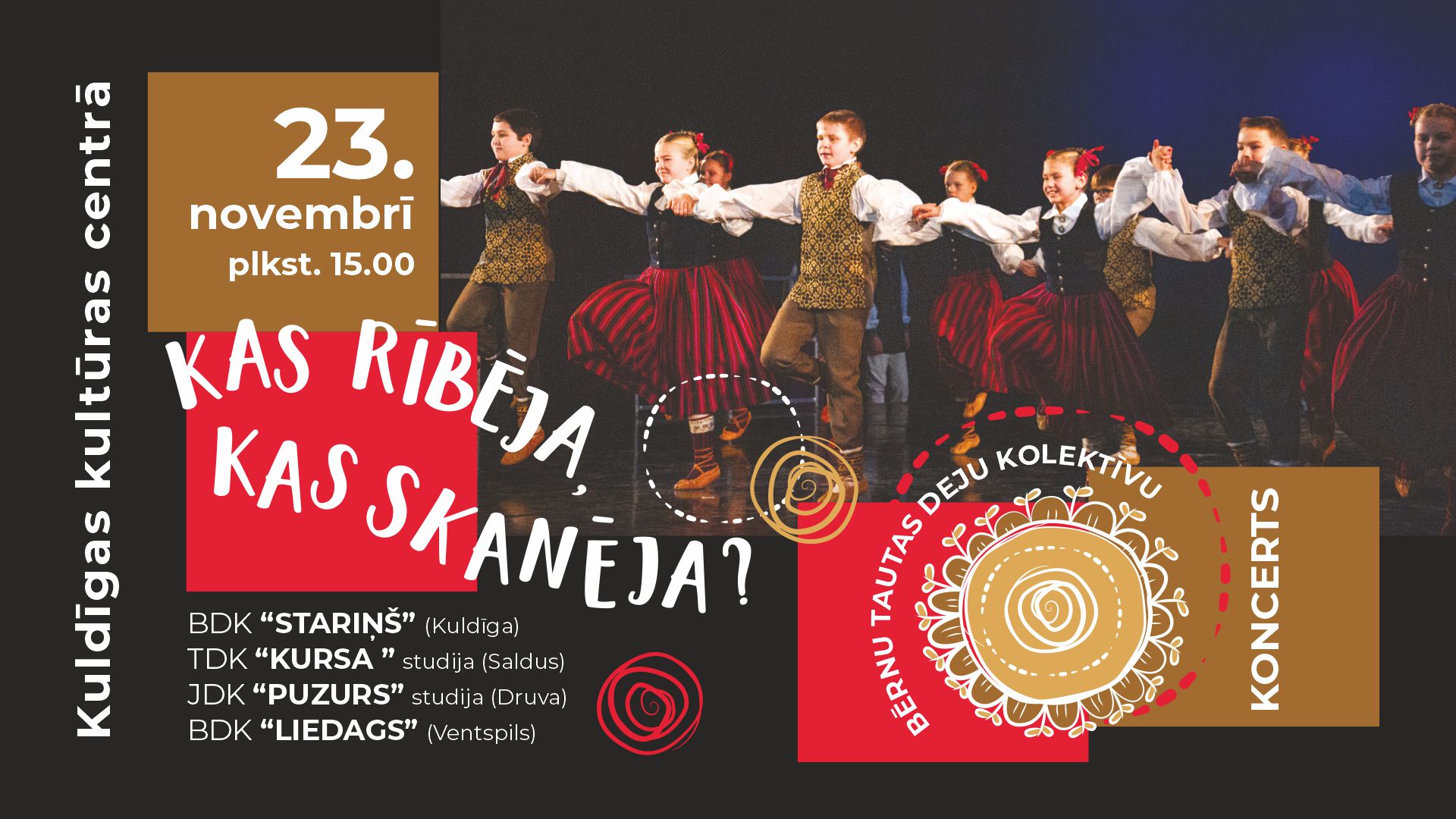 Koncertā piedalīsies: BDK „Stariņš” (Kuldīga), BDK „Liedags” (Ventspils), TDA „Kursa” studija (Saldus), JDK „Puzurs” studija (Druva). Biļetes iepriekšpārdošanā KKC kasē.