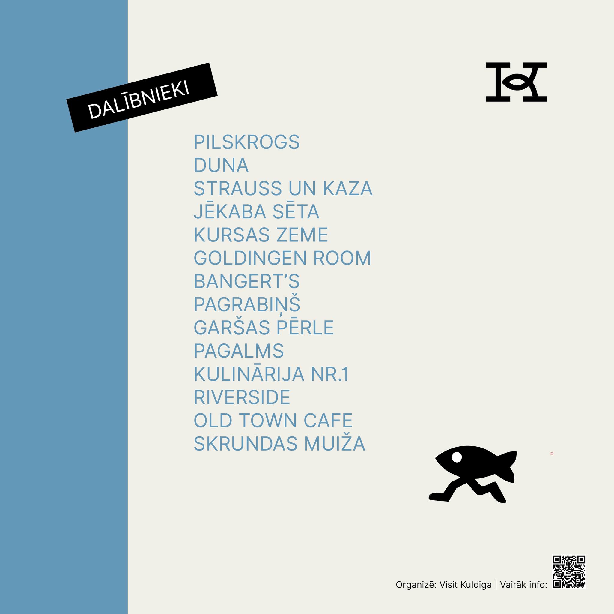 Divu nedēļu garumā Kuldīgas un novada kafejnīcas, restorāni un ēdinātāji piedāvās īpašus zivju ēdienus, kas nebūs atrodami ikdienas ēdienkartēs. Katrs pavārs radīs savu versiju – kādam tas būs viens īpašs sezonas ēdiens, citam vesels piedāvājums.