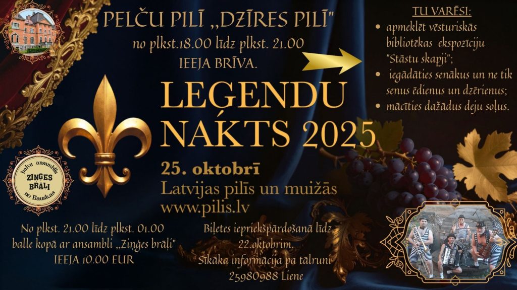 25. oktobrī no plkst. 18.00 Pelču pils aicina visus interesentus piedalīties tradicionālajā Leģendu nakts pasākumā, kas sola aizraujošu vakaru vēstures, deju un mūzikas noskaņās. Šī būs iespēja ne tikai ielūkoties vēsturiskās bibliotēkas noslēpumos, bet arī izkustināt kājas, apgūstot jaunus deju soļus un baudot īpašo pils atmosfēru kopā ar draugiem un ģimeni.