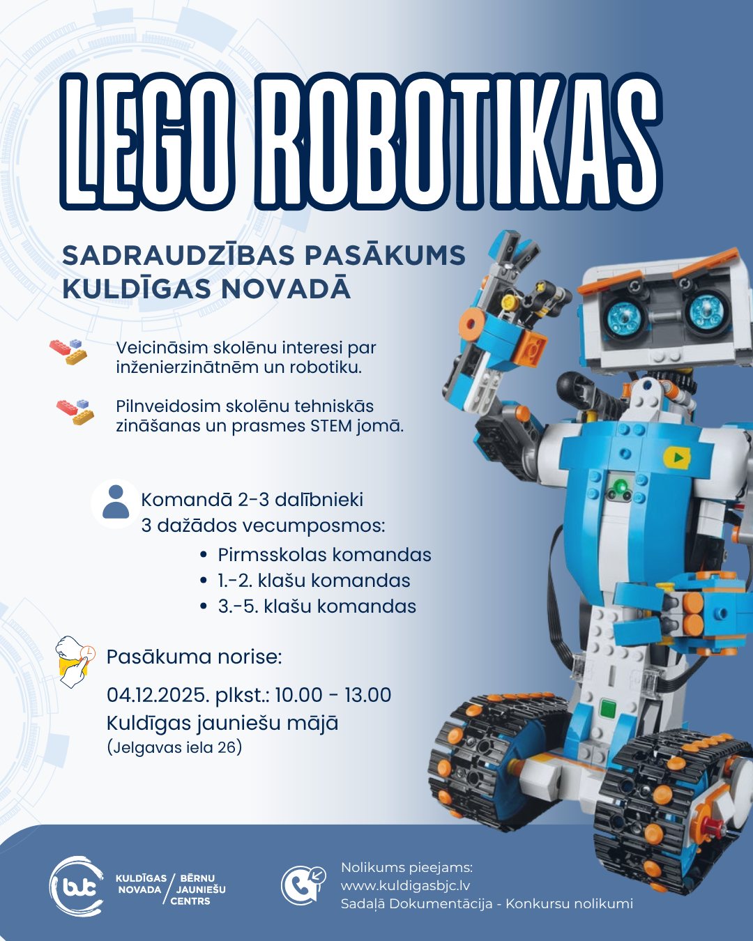 Kuldīgas novada Bērnu un jauniešu centrs sadarbībā ar novada LEGO robotikas interešu izglītības pedagogiem un Kuldīgas novada izglītības iestādēm organizē 1. LEGO robotikas sadraudzības pasākumu bērniem ar mērķi veicināt skolēnu interesi par inženierzinātnēm un robotiku, kā arī caur dažādām tehniskām un radošām aktivitātēm pilnveidot skolēnu tehniskās zināšanas un prasmes STEM jomā.