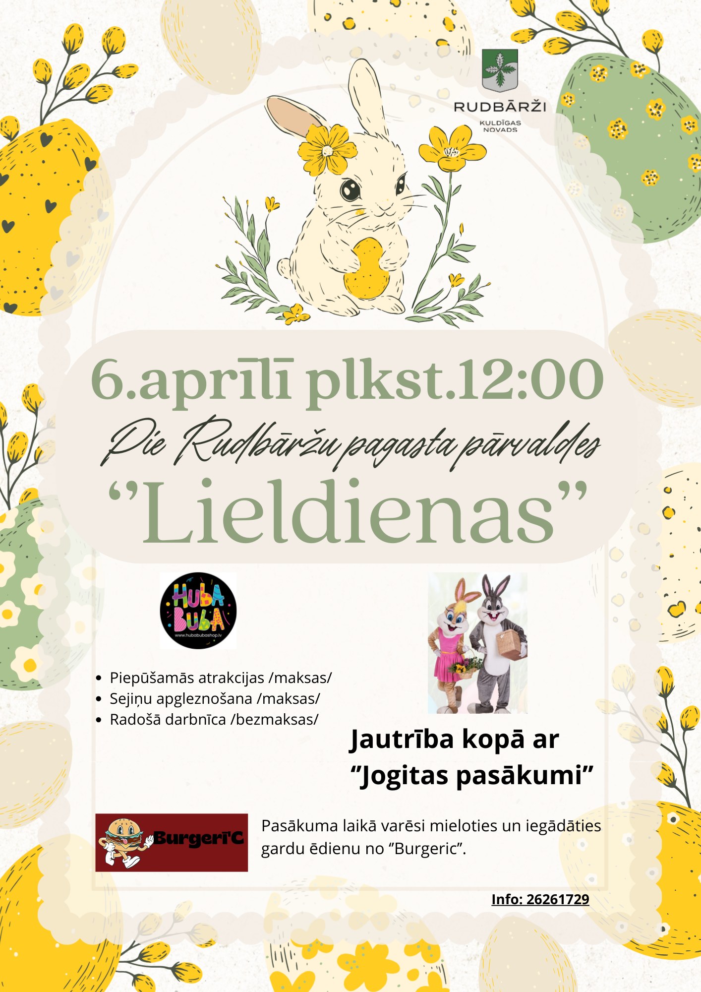 Būs piepūšamās atrakcijas, seju apgleznošana, radošā darbnīca. Jautrība kopā ar “Jogitas pasākumi” – Zaķis ar draugiem ir gatavs doties Lielās dienas svinībās. Krāsu juceklis, dziesmas un spēles. Svinēsim svētkus kopā! Pasākuma laikā varēsi mieloties un iegādāties gardu ēdienu no “Burgeric”.