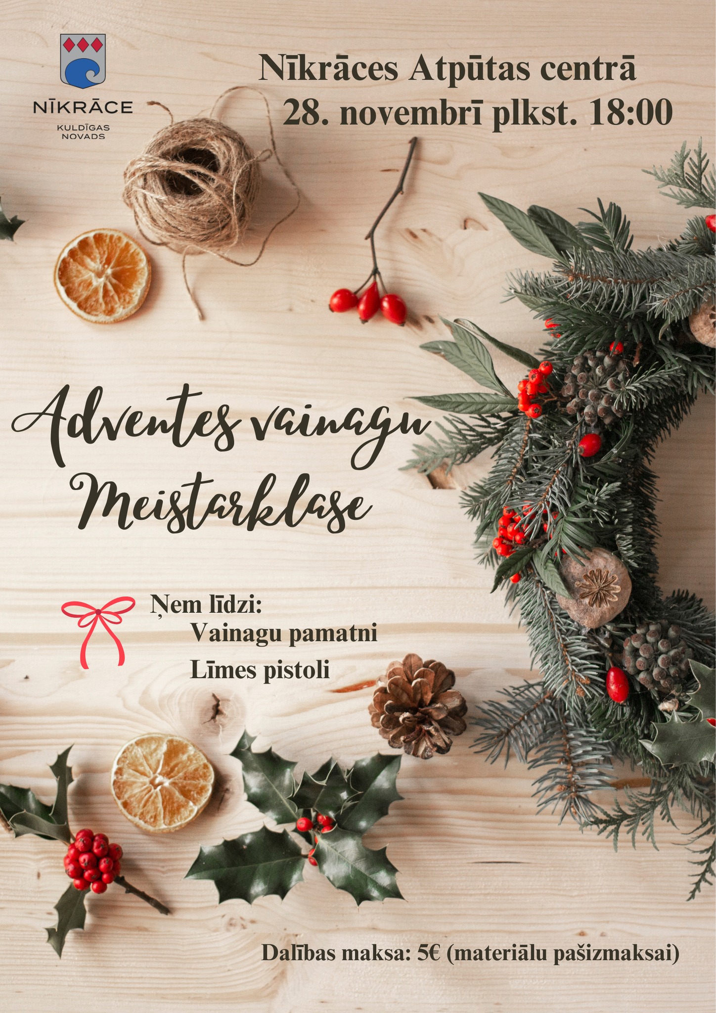 Aicināts ikviens izveidot savu adventes vainagu. Ņem līdzi savu vainaga pamatni un līmes pistoli. Dalības maksa 5 EUR materiālu pašizmaksai.