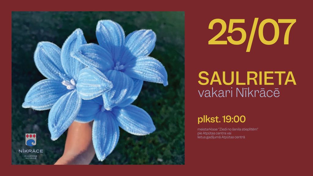 25. jūlijā 19.00 pie Atpūtas centra – meistarklase “Ziedi no šenila stieplītēm”. Lietus gadījumā pasākums notiks Atpūtas centrā.