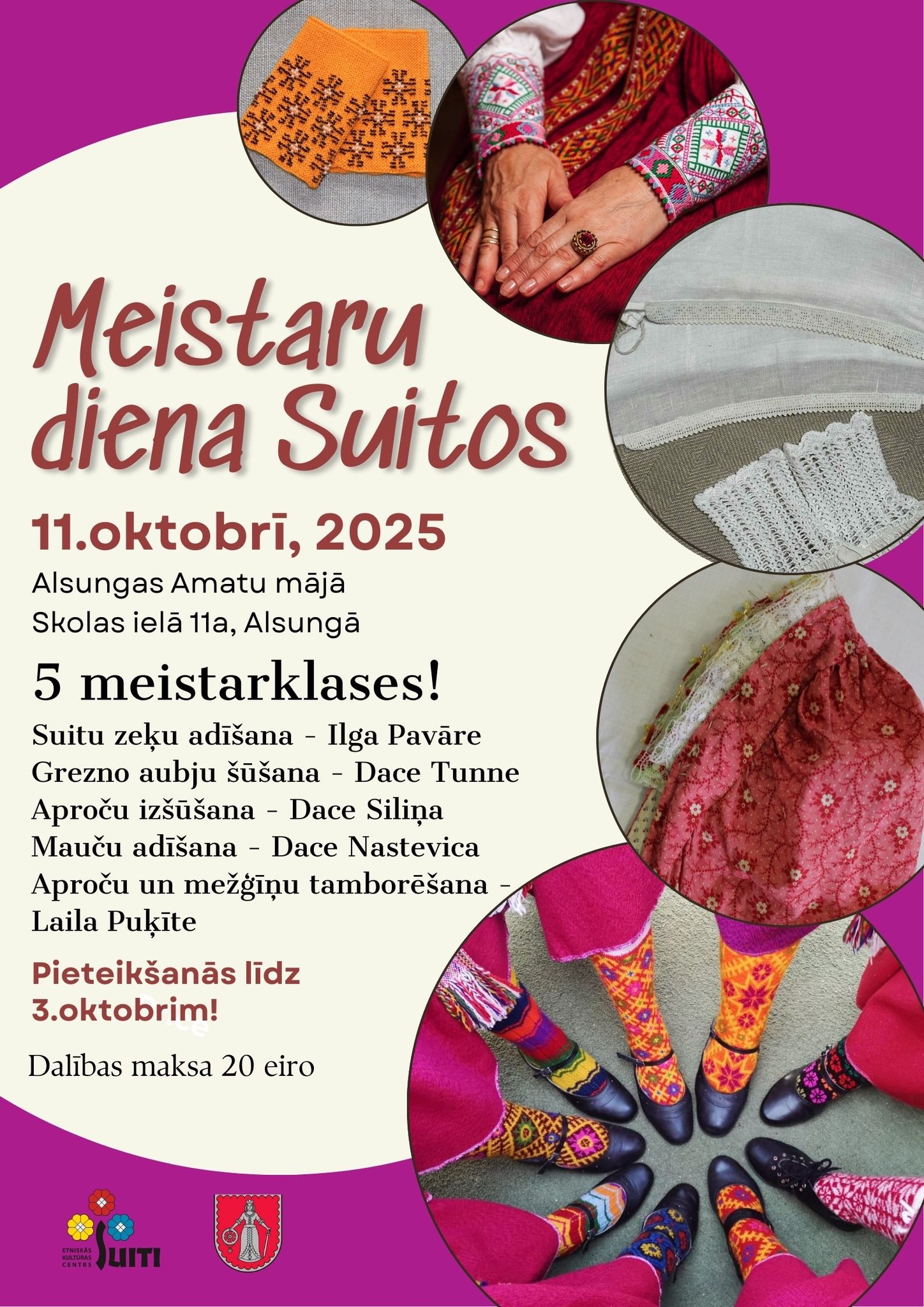 “Meistaru diena Suitos” ar piecām meistarklasēm: suitu zeķu adīšana (Ilga Pavāre), grezno aubju šūšana (Dace Tunne), aproču izšūšana (Dace Siliņa), mauču adīšana (Dace Nastevica) un aproču un mežģīņu tamborēšana (Laila Puķīte). Pieteikšanās līdz 3. oktobrim. Dalības maksa 20 EUR. Plašāka informācija pa tālr. 29222103 (Dace).