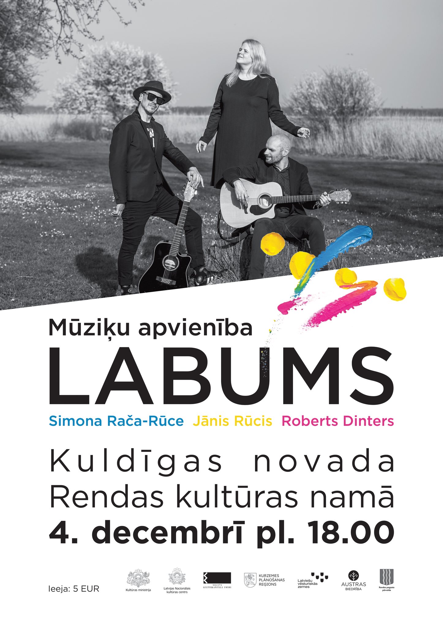 Ceturtdien, 4. decembrī, pulksten 18.00 mūziķu apvienība “Labums”, kuru veido Simona Rača-Rūce, Jānis Rūcis un Roberts Dinters, aicina uz koncertu Kuldīgas novada Rendas pagasta kultūras namā! Koncertā skanēs gan dziesmas no jaunā mūzikas albuma “Otrkārt”, gan komponista Imanta Kalniņa un citu autoru dziesmas. Ieeja: 5 EUR.