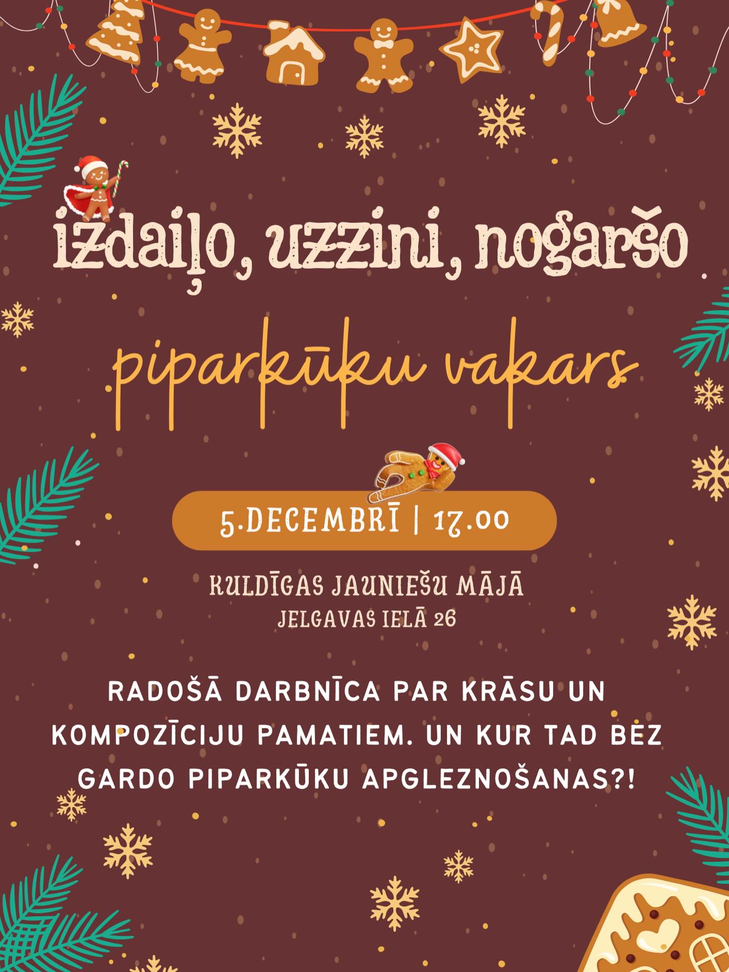 Radošā darbnīca par krāsu un kompozīcijas pamatiem. Katrs izveido savu “mini gleznu” uz piparkūkas. Konkurss – smieklīgākā piparkūka.