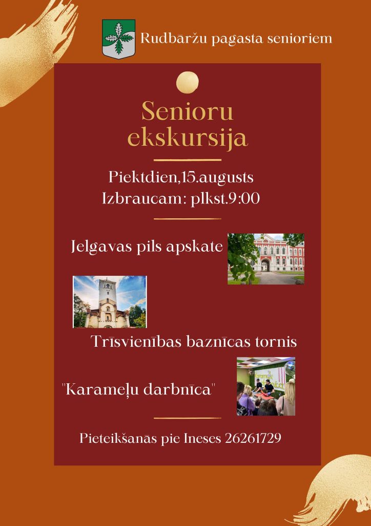 15. augustā ekskursija Rudbāržu pagasta senioriem. Apmeklēsim Jelgavas pili, Jelgavas Sv. Trīsvienības baznīcas torni, Karameļu darbnīcu. Pieteikšanās līdz 12. augustam pa tālr. 26261729 (Inese).