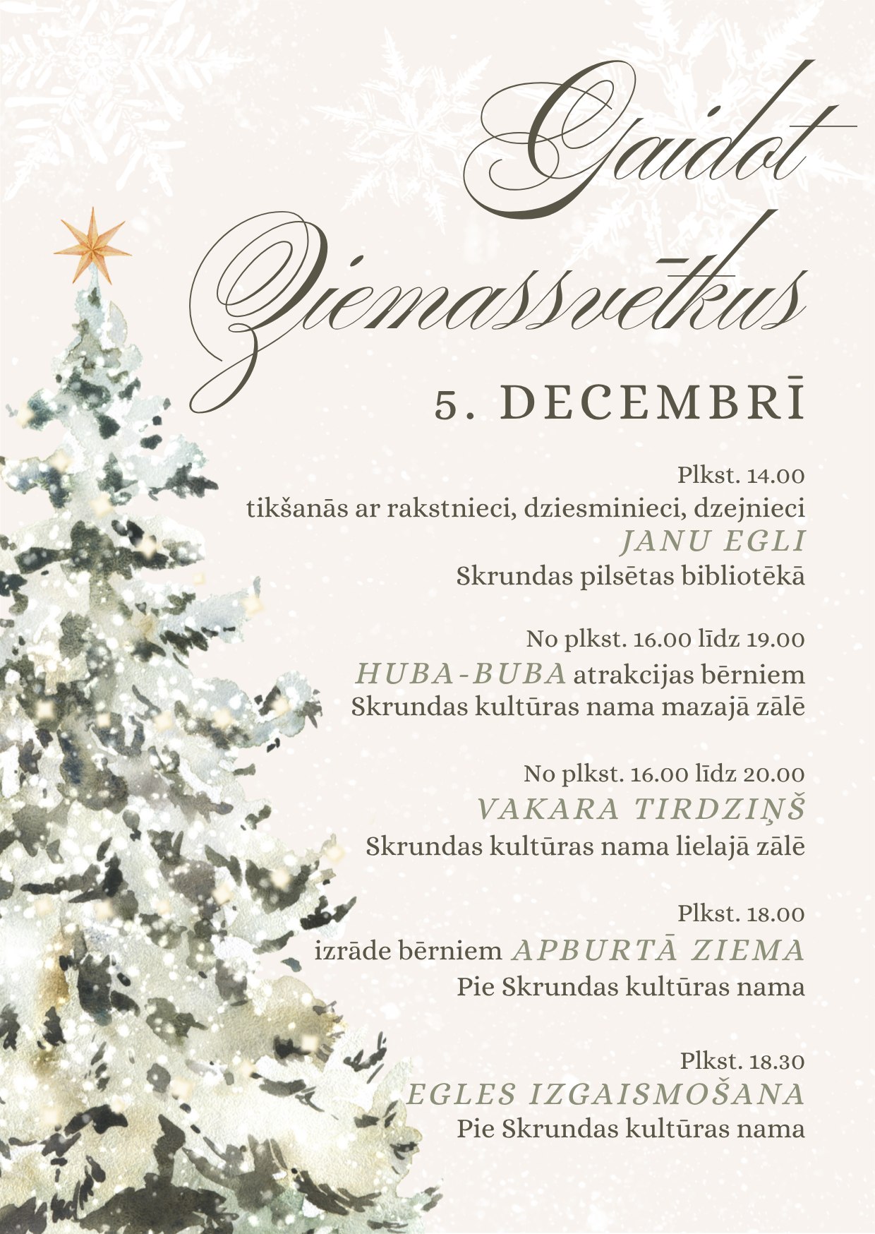 No plkst. 16.00 līdz 19.00 Skrundas kultūras namā norisināsies dažādas aktivitātes bērniem sadarbībā ar Huba-Buba. Ieejas maksa 5 EUR. Plkst. 18.00 pie Skrundas kultūras nama izrāde bērniem “Apburtā ziema”. Pasākuma laikā būs pieejama izbraukuma ēdināšana.