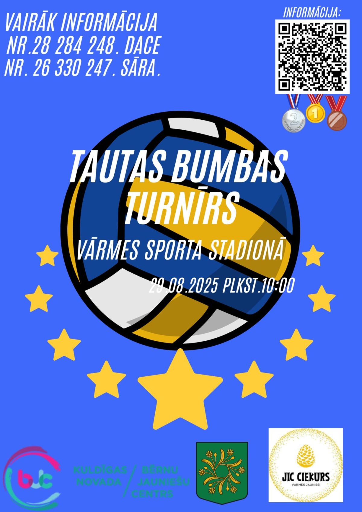Papildu informācija pieejama, sazinoties ar Daci pa tālruni 28284248 vai Sāru pa tālruni 26330247. Turnīru rīko Kuldīgas novada Bērnu un jauniešu centrs un jauniešu iniciatīvu centrs “Čiekurs” sadarbībā ar Vārmes jauniešiem.
