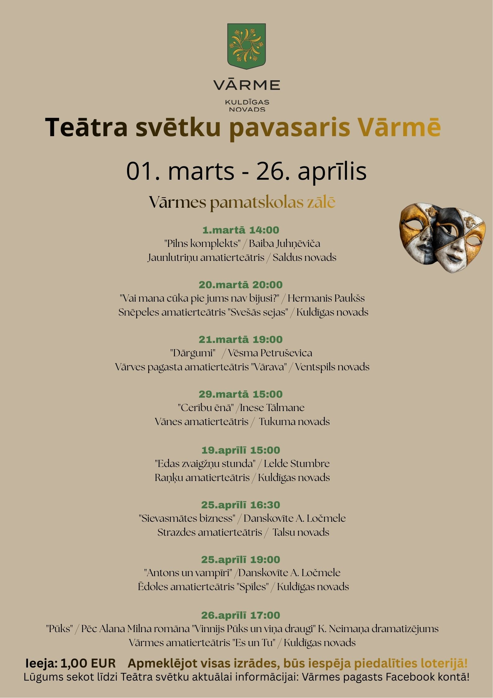 Aicinām ikvienu izbaudīt Teātra svētku pavasari Vārmē un atbalstīt amatierteātrus! Apmeklējot visas izrādes, būs iespēja piedalīties loterijā!