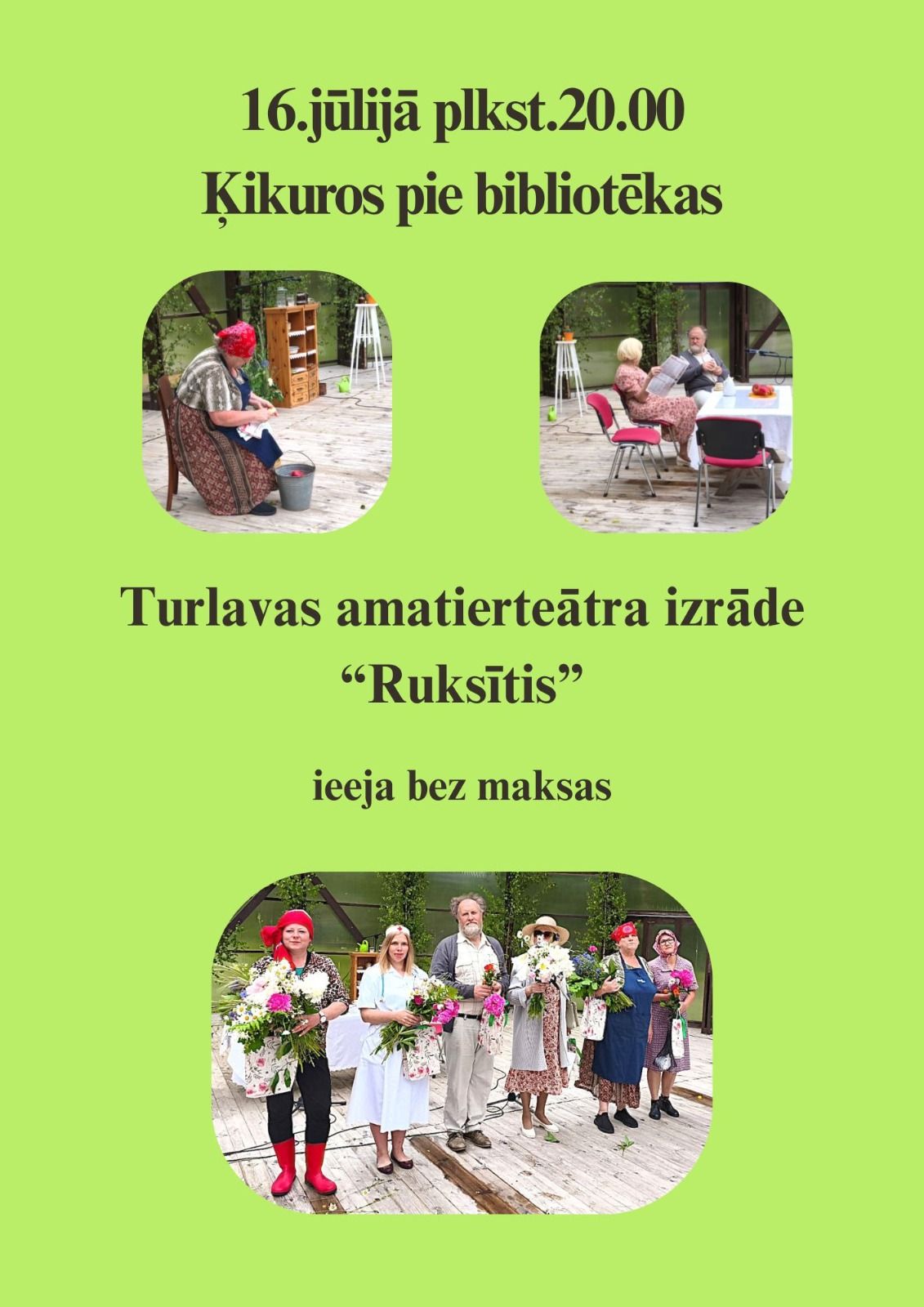 16. jūlijā 20.00 pie Ķikuru bibliotēkas – Turlavas amatierteātra izrāde “Ruksītis”. Ieeja bez maksas.