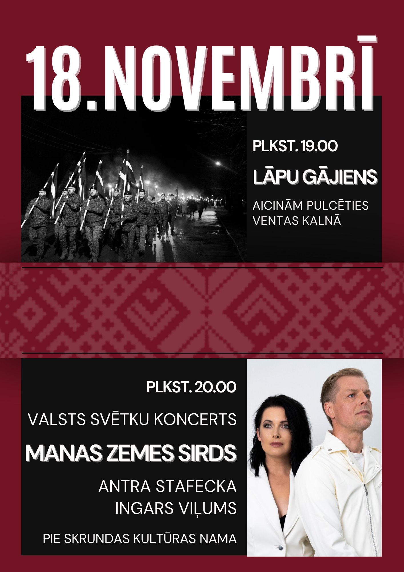 19.00 no Ventas kalna – svinīgs lāpu gājiens. Aicinām ikvienu ņemt līdzi savu lāpu un vienoties gaismas ceļā. Plkst. 20.00 pie Skrundas kultūras nama – valsts svētku koncerts “Manas zemes sirds”, kurā uzstāsies mūziķi Antra Stafecka un Ingars Viļums kopā ar pavadošo grupu.Mūziķi klausītājus vedīs cauri savām muzikālajām sajūtām un stāstiem, kas dziļi sakņojas latviskajā kultūrā un identitātē.Koncertā skanēs gan jaunie skaņdarbi, gan iemīļotas dziesmas no abu mākslinieku iepriekšējo gadu projektiem.